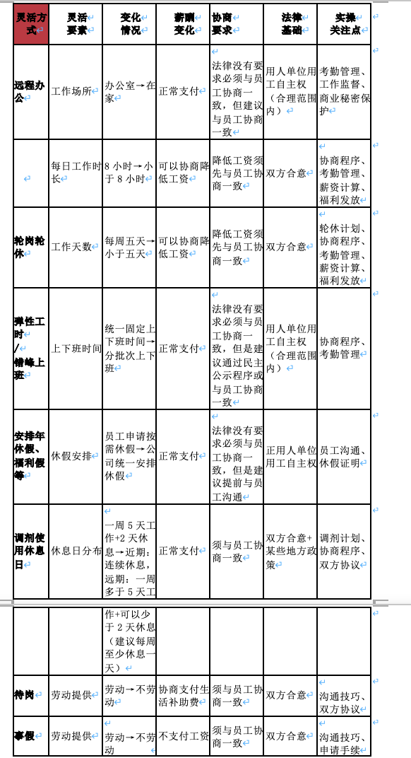 “靈活”是“固定”的反義詞,那么“靈活用工”的對立面一般是指常規的、固定的用工狀態,例如周一至五工作、周六日休息,早上九點上班、下午六點下班等等。“靈活用工”就是打破常規,產生變化。筆者以靈活的不同要素為出發點,針對標準工時制的員工, 將企業在疫情防控期間可以適用的靈活用工方式歸納如下表: