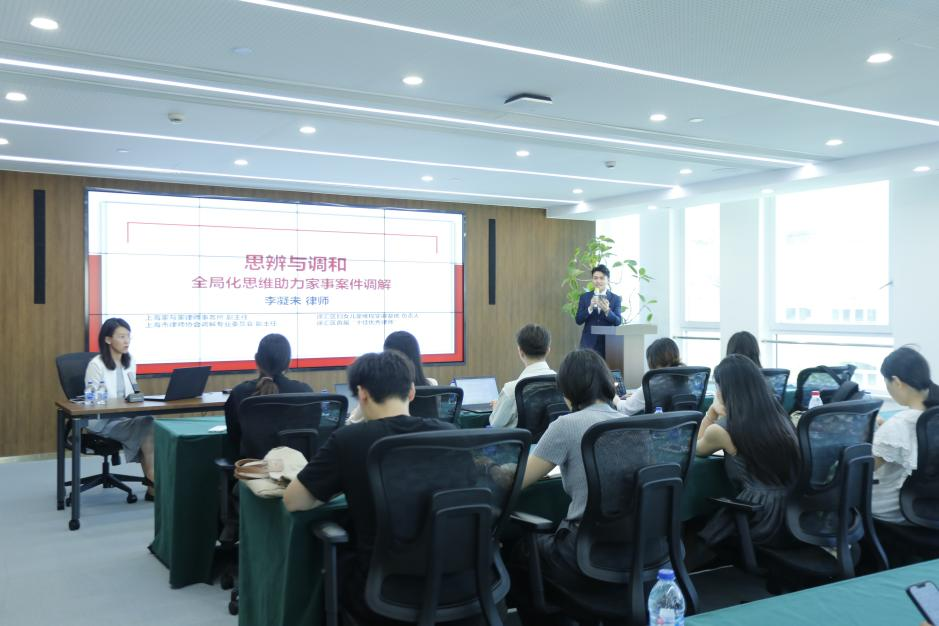 李凝未律師以“思辨與調和——全局化思維助力家事案件調解”為題展開分享。講座中,李凝未律師緊扣實務痛點,闡述了家事案件辦理中至關重要的全局思維與解決技巧,分享了關于涉子女撫養權、監護權等家事糾紛的調解技巧;涉婚外情、假離婚、家庭暴力等復雜家事糾紛的談判技巧;涉股權、代持、境外財產等復雜財產糾紛的解決技巧以及心理學視角下的談判與溝通藝術。李凝未律師以案說法,指導青年律師如何有效傾聽、共情,精準把握當事人心理,提升溝通效率和調解成功率。