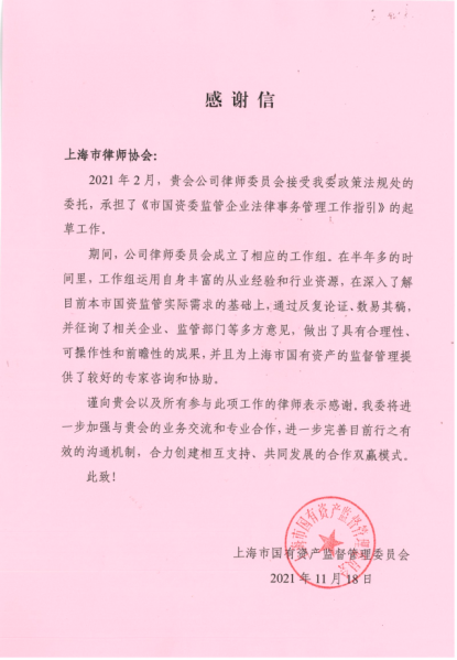 公司律師委員會以及參與此項工作的公司律師的專業(yè)、高效的工作成果與辛勤的付出得到了上海市國資委的高度認可。為此,上海市國資委向上海律協(xié)送來感謝信,感謝上海律協(xié)對于該項工作的大力支持。