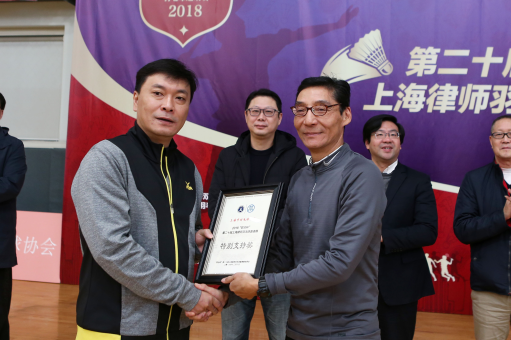 開幕式上,主辦方為感謝二十年來對“聯(lián)合杯”賽事提供持續(xù)支持的單位和個人,舉行了簡短的頒獎答謝儀式。忻峰秘書長向黃浦律師工作委員會贈送二十周年特別紀(jì)念衫;朱洪超律師向上海市羽毛球協(xié)會頒發(fā)二十周年特別支持獎;江憲律師向伴隨“聯(lián)合杯”開賽以來一直堅持參賽的三位律師代表頒發(fā)了二十周年榮譽(yù)紀(jì)念獎;劉輝局長向上海市聯(lián)合律師事務(wù)所頒發(fā)二十周年特別貢獻(xiàn)獎。