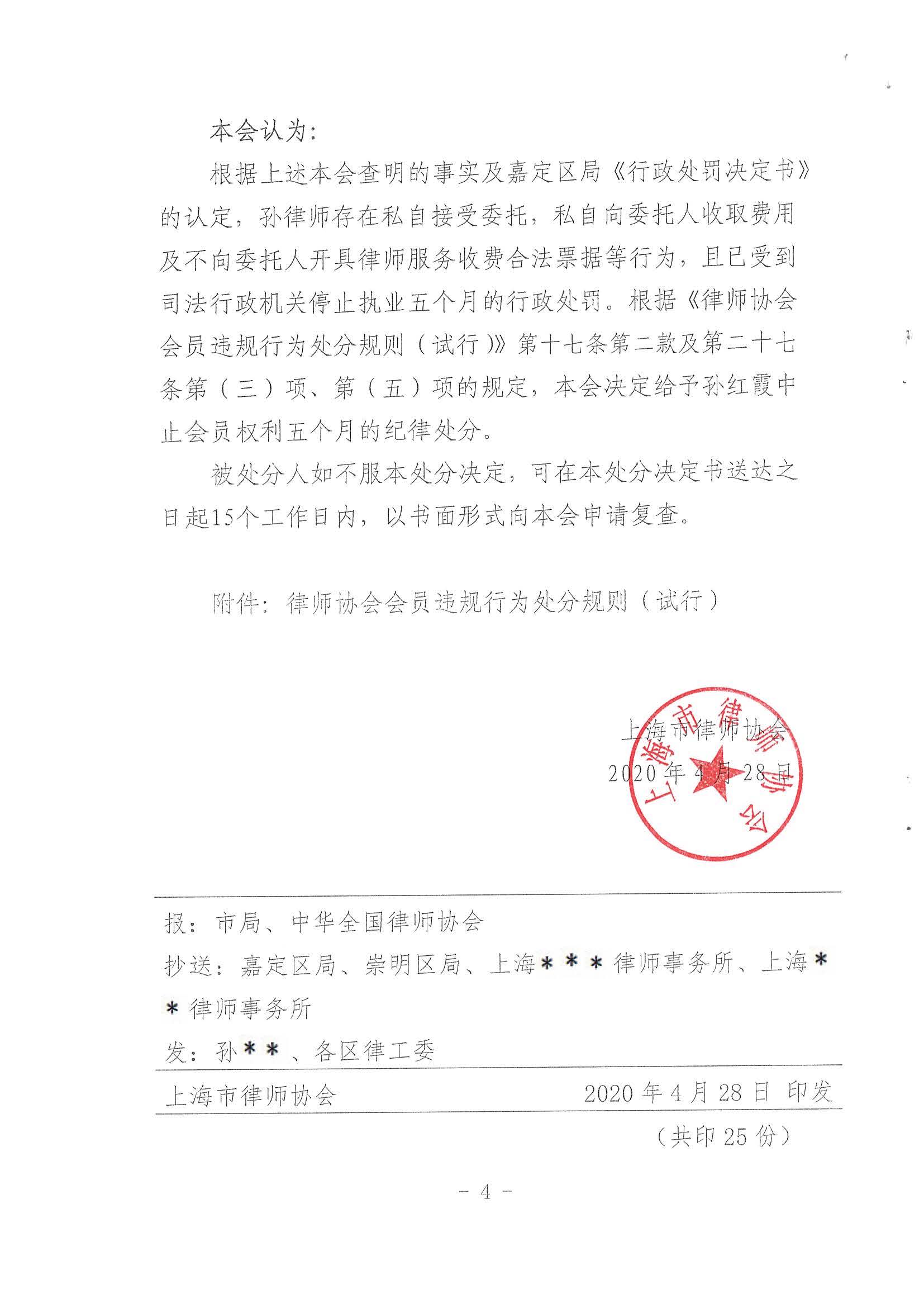 律所和律師違規收案、收費的,上海市律師協會將根據《處分規則(試行)》給予違規律所和律師以訓誡、警告或者通報批評的紀律處分;情節嚴重的,給予公開譴責、中止會員權利一個月以上一年以下或者取消會員資格的紀律處分: