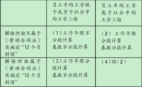 1、上表“工作年限分段計算”指《勞動合同法》實施前后的工作年限分別計算,并分別適用《勞動合同法》實施前后有關“滿半年,不滿一年”和“不滿半年”的規(guī)定,及“12個月封頂”的規(guī)定。