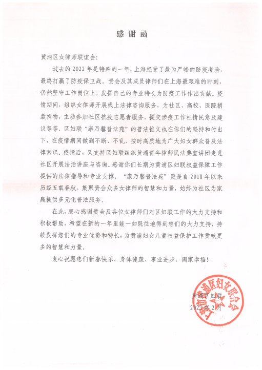 堅決維護(hù)婦女兒童權(quán)益,堅持公益普法,黃浦區(qū)女律師聯(lián)誼會將秉持初心,一如既往做出自己的努力,貢獻(xiàn)自己的力量!
