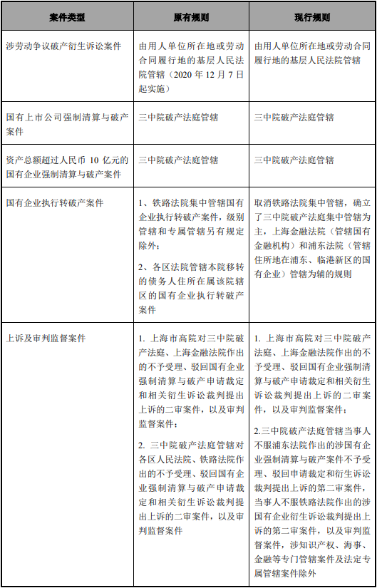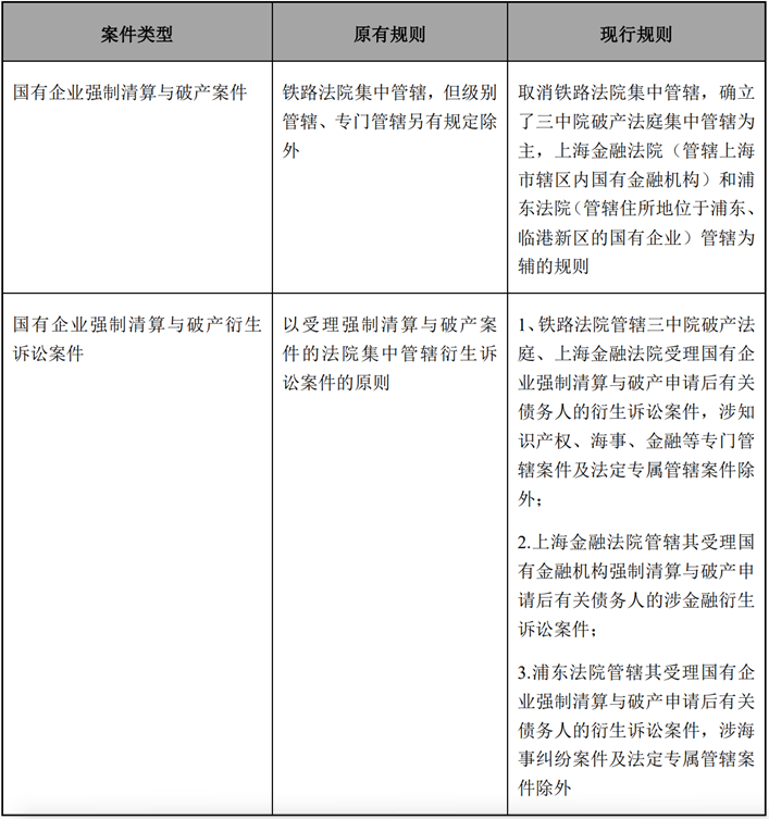 3. 自2022年1月1日起,鐵路法院不再集中管轄國(guó)有企業(yè)強(qiáng)制清算與破產(chǎn)案件,轉(zhuǎn)由上海市第三中級(jí)人民法院破產(chǎn)法庭(以下簡(jiǎn)稱“三中院破產(chǎn)法庭”)進(jìn)行集中管轄,不再以國(guó)有企業(yè)的性質(zhì)作為確定集中管轄的依據(jù)。