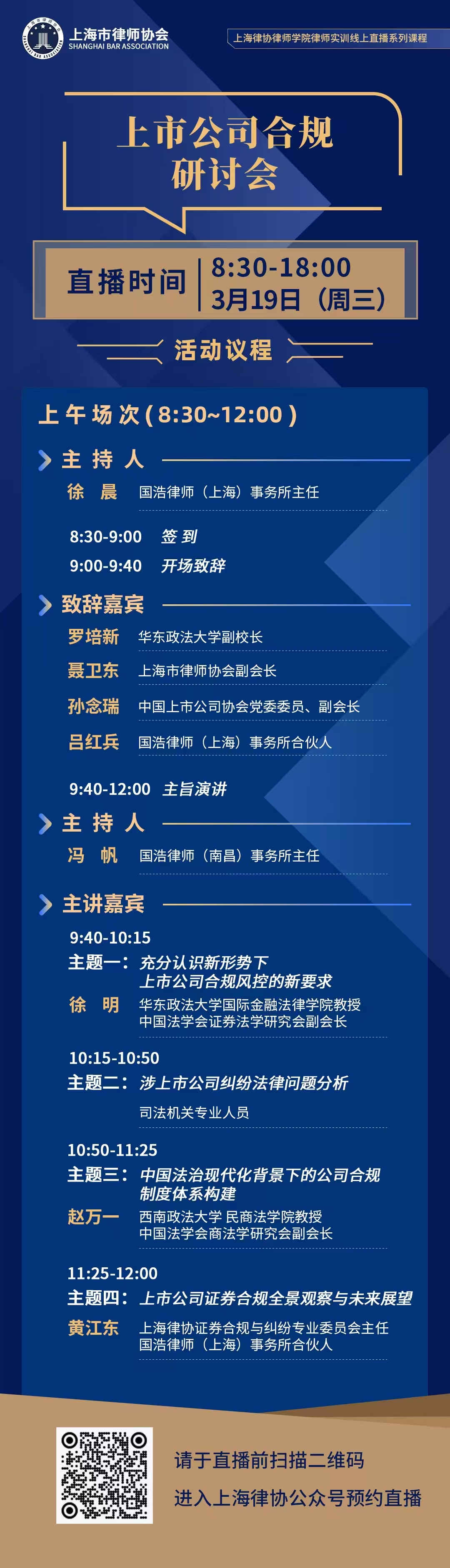 基于此,上海律協證券合規與糾紛專業委員會舉辦“上市公司合規”研討會,為建立健全良性高效的上市公司合規體系,更好服務資本市場高質量發展貢獻智慧與力量。具體安排如下: