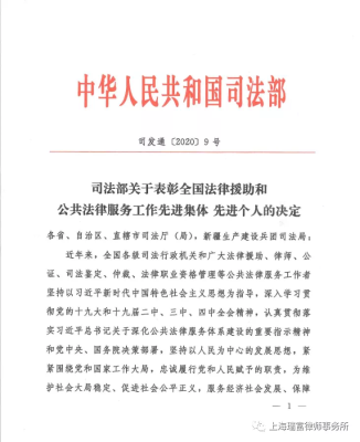 日前,國家司法部發文表彰了一批全國法律援助和公共法律服務工作先進集體和先進個人。上海瑞富律師事務所被評為“全國公共法律服務工作先進集體”。據悉,本市共有8家律師事務所在本次表彰中獲此榮譽。