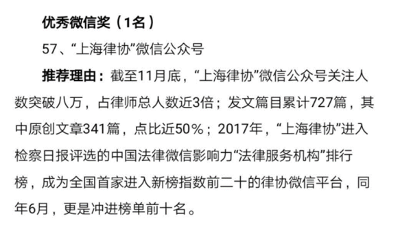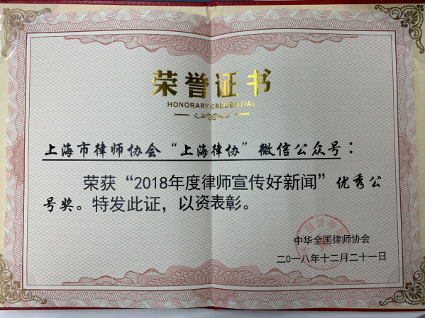 2018年12月21日,在全國律協舉辦的2018年“走基層、進律所”媒體交流日活動中,全國律協表彰了宣傳工作成績突出的地方律師協會及優秀工作者代表,上海市律師協會“上海律協”微信公眾號榮獲了“2018年度律師宣傳好新聞”優秀公號獎。