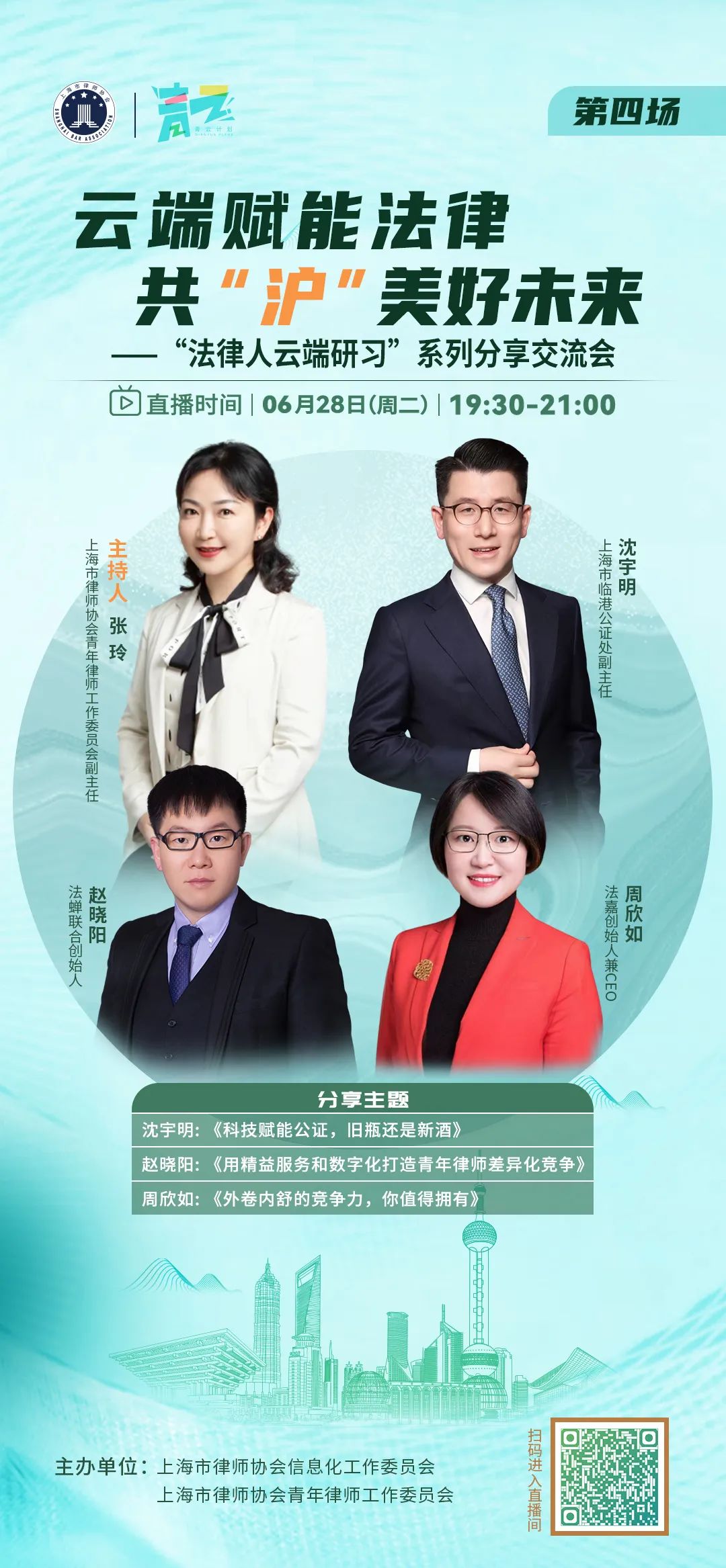 本次收官之作,我們特別邀請到了來自法律科技、公證、資深法務等不同領域的分享嘉賓,為大家帶來《云端賦能法律 共“滬”美好未來》話題分享,期許跨界視角的碰撞能為法律人帶來更多靈感和思考。