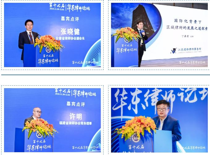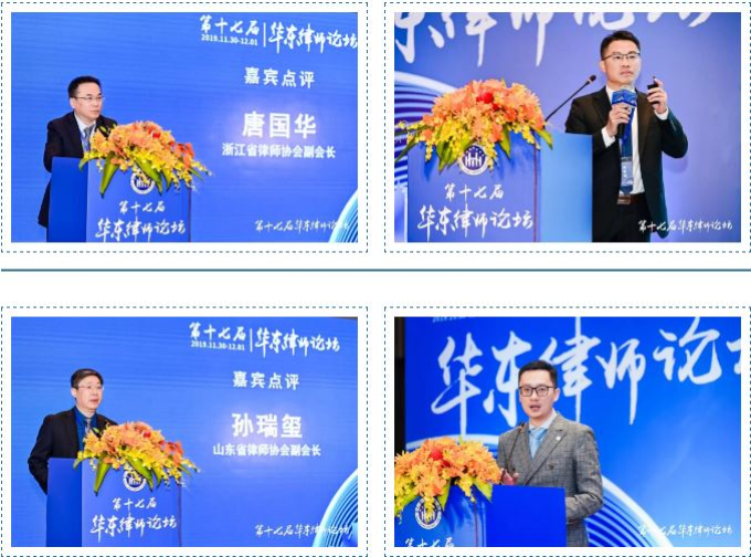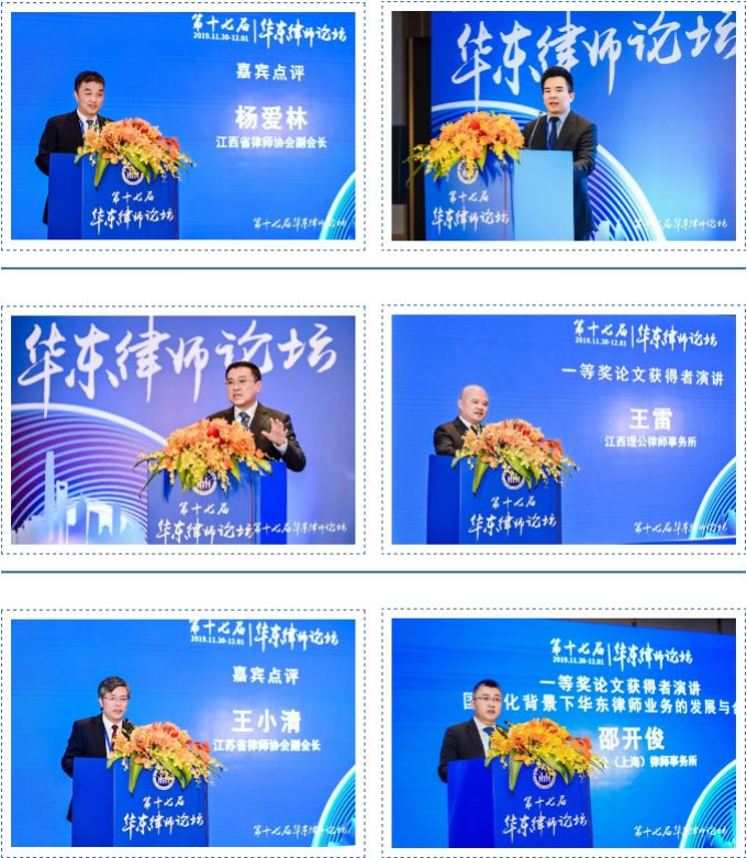 閉幕式上,一等獎?wù)撐淖髡呓K漫修律師事務(wù)所丁嘉宏律師、安徽天貴律師事務(wù)所黃中梓律師、福建壺蘭律師事務(wù)所吳國章律師、浙江六和律師事務(wù)所許力先律師、山東求新律師事務(wù)所闞吉峰律師、江西理公律師事務(wù)所王雷律師、北京尚公(上海)律師事務(wù)所邵開俊律師作交流發(fā)言,安徽省律師協(xié)會副會長張曉健、福建省律師協(xié)會常務(wù)理事許明、浙江省律師協(xié)會副會長唐國華、山東省律師協(xié)會副會長孫瑞璽、江西省律師協(xié)會副會長楊愛林、上海市律師協(xié)會副會長楊波、江蘇省律師協(xié)會副會長王小清分別進行論文點評。