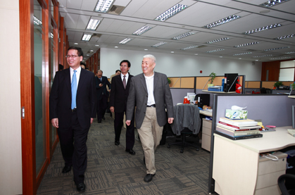 呂南停副區(qū)長(左)在吳伯慶主任陪同下視察金茂新辦公室