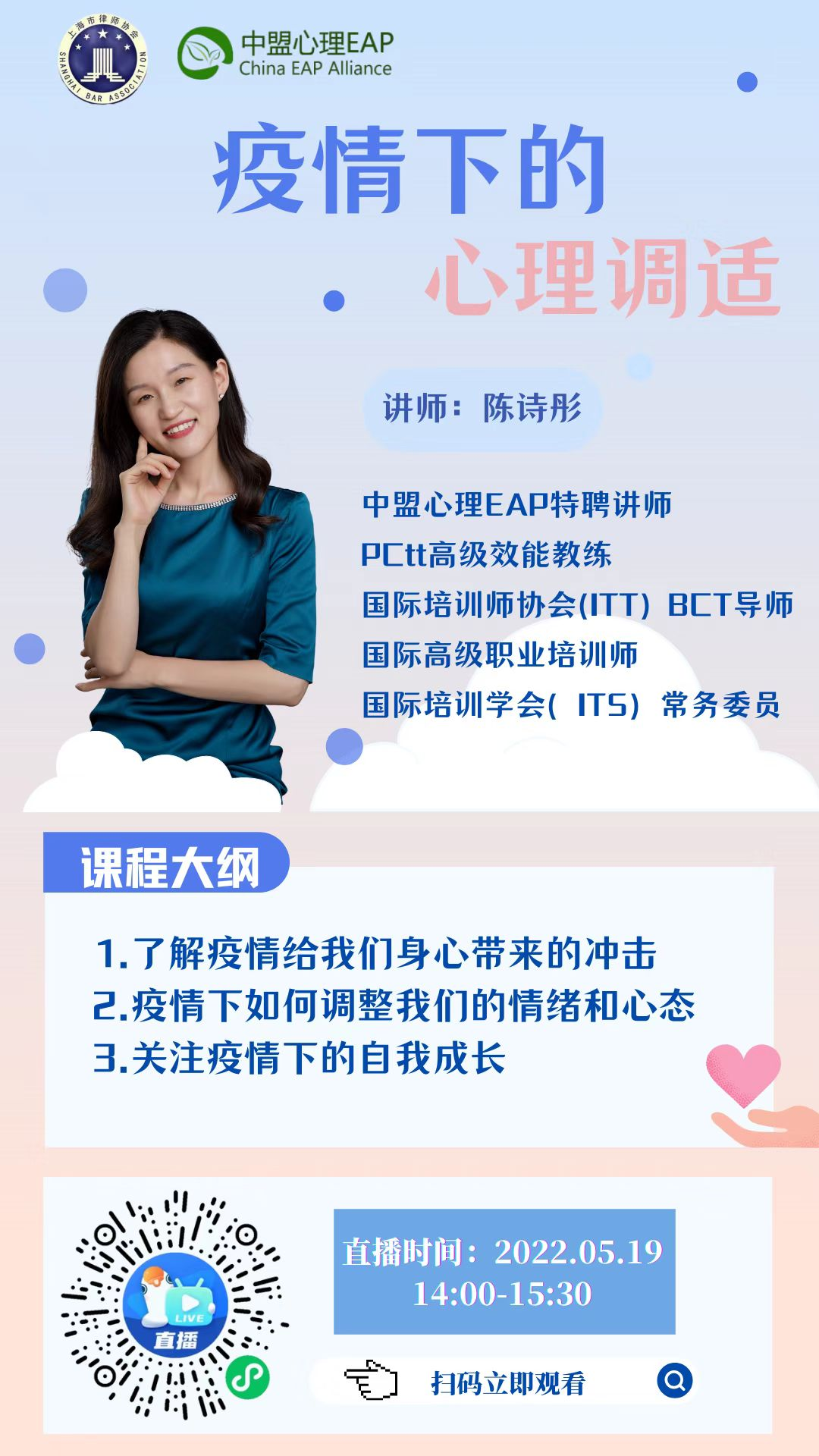 主講嘉賓:1、賀琳 :中盟心理特邀EAP講師 、國家二級注冊心理咨詢師 、上海交通大學特聘講師、DISC認證講師、EI Genos情感智能國際認證講師;