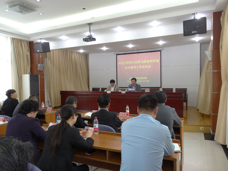 為更好地發揮廣大律師在參與地區經濟建設、維護社會穩定中的職能作用,依法推進我區拆違和環境綜合整治工作。2015年10月27日,閔行區司法局組織召開了律師行業參與拆違和環境綜合整治工作動員會。區司法局黨委副書記、局長金海民、黨委副書記周信根出席會議。