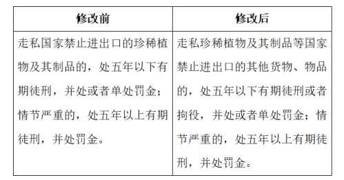 根據《刑法修正案(七)》,最高人民法院、最高人民檢察院發布《關于執行<中華人民共和國刑法>確定罪名的補充規定(四)》(法釋〔2009〕13號),將原“走私珍稀植物、珍稀植物制品罪”修改為“走私國家禁止進出口的貨物、物品罪”。
