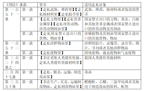 “走私罪”在《刑法》第三章“破壞社會主義市場經濟罪”中的第二節。該節的走私罪名中,除了第一百五十三條走私普通貨物、物品罪之外都列明了具體走私對象,《刑法》第三百三十四條之一非法采集人類遺傳資源、走私人類遺傳資源材料罪,第三百四十七條走私、販賣、運輸、制造毒品罪及第三百五十條非法生產、買賣、運輸制毒物品、走私制毒物品罪也列明了具體走私對象。詳見下表: