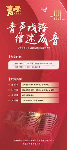 為慶祝中國共產黨建黨九十九周年,豐富律師業余文化生活,由上海市律師協會青年律師工作委員會、黃浦律師工作委員會共同主辦的“青聲戲語 律述成音”青年律師配音大賽正式開啟,快來一起秀出你的聲音!