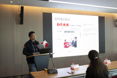 江躍中主任以“努力寫(xiě)出可信、可親、可學(xué)的百姓典型”為主題,從他寫(xiě)的通訊《徐阿婆還債記》引申開(kāi),寫(xiě)通訊必須要深入調(diào)查研究,避免報(bào)道失真,同樣的素材可選取不同的表達(dá)方式,充分運(yùn)用背景材料來(lái)寫(xiě)作報(bào)道,寫(xiě)好新聞報(bào)道的要素包括5個(gè)W和1個(gè)H。