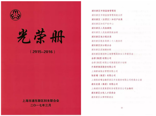 此外,浦東新區女律師聯誼會還獲得“2015-2016年度浦東新區三八紅旗手(集體)”榮譽稱號。該榮譽由上海市浦東新區婦女聯合會授予,以表彰立足崗位建功立業、弘揚優秀女性職業精神的先進集體。