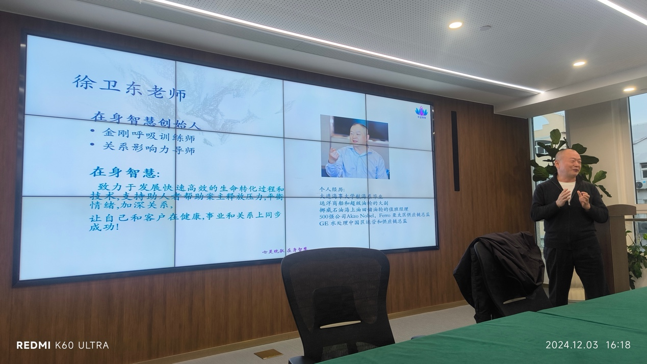 第二部分由特邀嘉賓徐衛(wèi)東老師分享“金剛呼吸法”。徐老師帶領(lǐng)與會(huì)律師通過三輪“呼與吸”釋放身體上的緊張、情感上的淤積殘留以及頭腦中的糾結(jié)和混亂。徐老師更提出“注意力法則”,強(qiáng)調(diào)律師應(yīng)將注意力聚焦在健康、事業(yè)、關(guān)系的積極面,保持身、心、意合一,有利于事業(yè)、生活更加順利與美好。