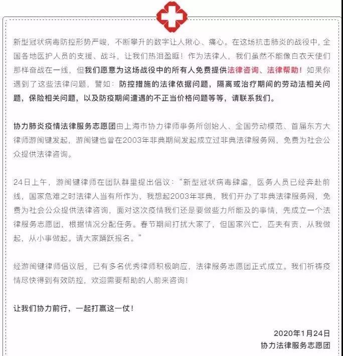上海市協力律師事務所在抗擊疫情期間全面上線了微信、微博法律咨詢渠道。由市律協理事、上海市協力律師事務所創始人游閩鍵律師牽頭組成的疫情法律服務志愿團在線上就隔離或治療期間的勞動法相關問題,保險相關問題,以及防疫期間遭遇的不正當價格等問題為人民群眾進行解答,為抗擊疫情積極提供法律支援。