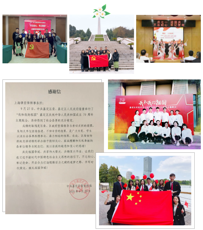 紅色教育培育愛國主義精神。組織全體黨員赴新四軍太湖游擊隊紀念館開展專題組織生活會,傳承紅色基因,弘揚革命精神。會上,每名黨員簽署《律師執業規范承諾書》,承諾遵守律師執業規范,以更高的標準嚴格要求自己。利用業余時間組織學習舞蹈《紅梅贊》,參與區司法行政系統組織開展的各類主題黨日活動;全程參與“我和我的祖國”嘉定區慶祝中華人民共和國成立70周年主題歌會;市司法局微博在國慶當天發布了律宏所拍攝的“我對祖國大聲表白”視頻,用優美的舞姿、高昂的歌聲、動情的表演,抒發熱愛祖國、祝福祖國、建設祖國的真摯情懷。