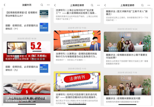 依法戰疫保障社會穩定。律師為區衛生健康委提供專業法律服務和支持,參與撰寫疫情通報,做好區疫情防控工作書面材料的法制審核。為做好疫情期間的法律宣傳、法律服務,律宏所響應區總工會的號召,相繼推出“毓秀嘉定·法治‘工’開課——防疫·微劇場、防疫·微課堂、防疫·微服務”,律師們拍攝了配套視頻,使企業和勞動者能更生動形象地了解和知曉特殊時期的法律規定。疫情期間,還相繼推出了法律特刊、圈圈講法、“防疫·直播間、防疫·微評估”等新舉措,采用在線直播課程的形式,構建法治框架,提供律師在線解答和互動交流。并將繼續以“對標新需求、整合新思路、運用新媒體、開拓新渠道、引領新趨勢”為理念,“零距離”服務企業勞動用工合法合規,“零距離”維護職工合法權益,協力推進勞動關系和諧穩定,更好維護疫情期間社會穩定大局。