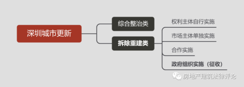 對(duì)于拆除重建類城市更新活動(dòng),《深圳市城市更新辦法實(shí)施細(xì)則》(深府〔2012〕1號(hào))第三十三條規(guī)定了四種實(shí)施方式,其中“(四)政府組織實(shí)施”方式涉及到房屋征收。雖然該《實(shí)施細(xì)則》為原《深圳市城市更新辦法》的配套規(guī)定,但該第三十三條在《深圳市城市更新實(shí)施條例》于2021年3月1日正式施行后依舊得到沿用。