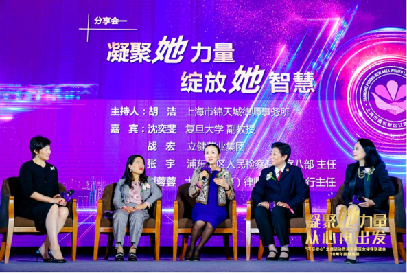 下半場,上海市錦天城律師事務所胡潔律師主持分享會,由復旦大學副教授沈奕斐,立健藥業集團高管戰宏。浦東新區人民檢察院檢察八部主任張宇,大成(上海)律師事務所執行主任劉蓉蓉,四位來自不同行業的優秀女性圍繞“凝聚她力量 綻放她智慧”主題分享她們綻放女性力量的親身經歷,為在場女性同胞們提供有益的經驗。