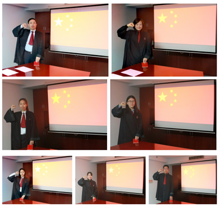 “我是中華人民共和國(guó)律師,忠于憲法,忠于祖國(guó),忠于人民,維護(hù)當(dāng)事人合法權(quán)益,維護(hù)法律正確實(shí)施,維護(hù)社會(huì)公平正義,恪盡職責(zé),勤勉敬業(yè),為建設(shè)社會(huì)主義法治國(guó)家努力奮斗!