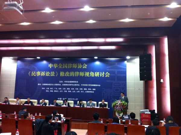 2011年11月27日,上海市律師協會民事業務研究委員會主任譚芳律師、副主任竺建平律師、勞動法業務研究委員會主任陸胤律師代表上海律師赴北京中央財經大學,參加了由中華全國律師協會主辦、全國律協憲法與人權委員會、全國律協民事專業委員會承辦的“《民事訴訟法》修改的律師視角”研討盛會。來自全國22個省、自治區、直轄市約200名律師代表及委員參會。