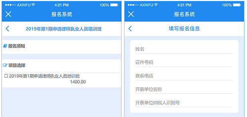 2、正式登陸后,選擇繳費項目“2019年第1期申請律師執業人員培訓班”。