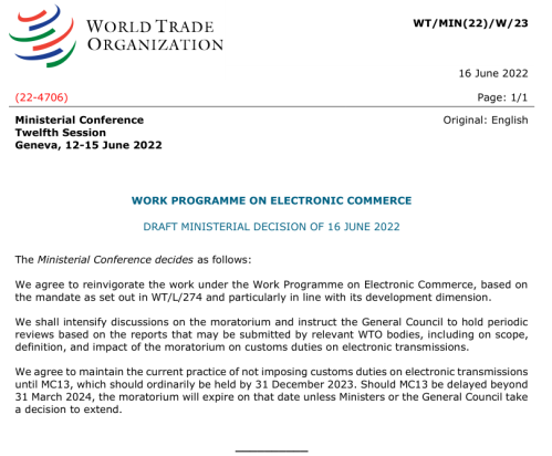 WTO成立初衷是減少關稅,如果討論增加關稅,WTO就變性了。本次會議就是第12次部長會議,會議同意再推遲兩年,如果兩年后沒有達成共識,這個推遲征稅的決定自動失效。數字傳輸體量巨大,深入到當今世界的各個方面,一旦開征關稅,國際貿易就面目全非了。這個推遲兩年的決定只有寥寥數行字(全文見下圖),但意義重大,很多專家說它把WTO從死亡邊緣挽救回來了。但這個挽救是臨時性的,兩年后的第13次部長會議,這個危險將再次降臨。