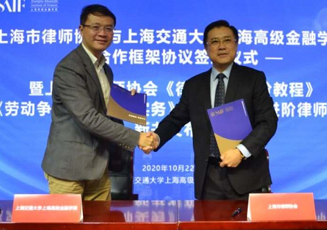 上海律協(xié)副會(huì)長(zhǎng)楊波代表上海律協(xié)與上海交通大學(xué)高級(jí)金融學(xué)院簽訂合作框架協(xié)議。