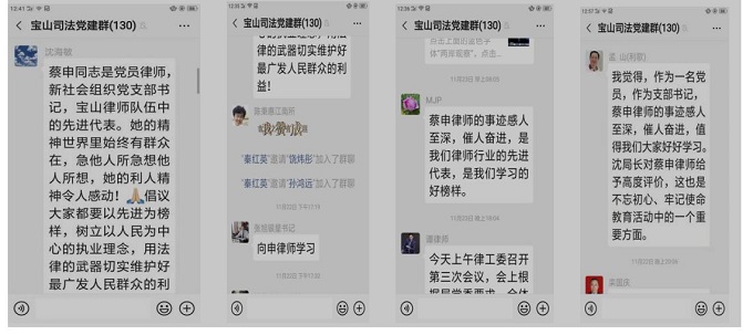 局長沈海敏通過寶山司法黨建群號召全體司法行政人員要以蔡申同志為榜樣,樹立以人民為中心的執業理念,用法律的武器切實維護好最廣大人民群眾的利益。黨員們紛紛在群里發言表示,蔡申律師是寶山律師行業的先進代表,為有這樣的模范人物感到光榮和自豪,她的事跡對律師行業是巨大鼓舞和鞭策,全體律師要以蔡申同志為榜樣,不忘初心、牢記使命,積極工作,熱情奉獻。