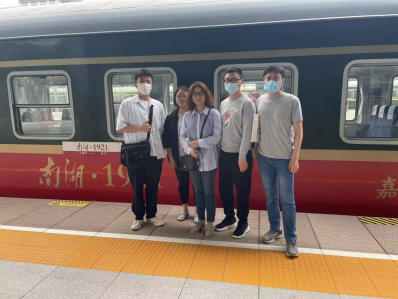 31日上午9時,一行人于上海西站集合乘坐“南湖1921紅色專列”前往嘉興。該車內(nèi)部應(yīng)用復(fù)古裝飾元素,外部以紅、金、綠為配色,整車兼具紅色文化元素和上世紀(jì)二十年代古樸風(fēng)格。