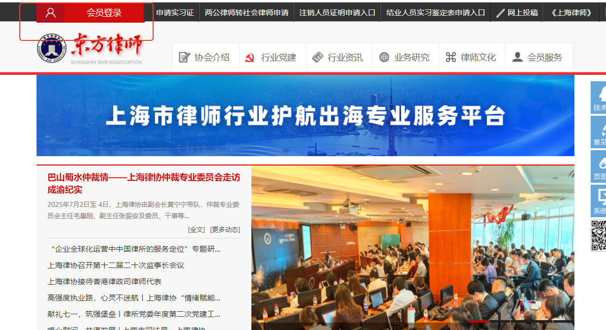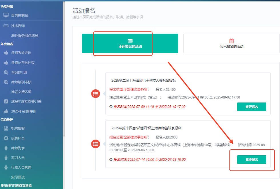 2. 進入上海律師會員系統界面,選擇“活動報名”菜單,點擊“我要報名”;