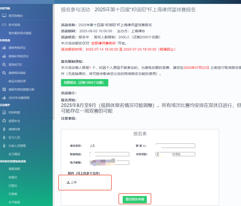 3. 填寫信息,并上傳附件表格提交(“邦信陽杯”2025年第十四屆上海律師籃球隊員登記表)。
