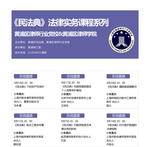 為進一步加強《民法典》在黃浦律師中的宣傳與研究,提升黃浦律師的業務能力,黃浦區司法局、黃浦律工委聯合LCOUNCIL 理購(上海)企業服務有限公司,依托黃浦區律師行業黨校、黃浦區律師學院于8月中旬至9月中旬開展了《民法典》法律實務課程系列線上培訓,同時本項目也是黃浦區律師行業黨校和黃浦區律師學院本年度重要的律師培訓課程之一,現已圓滿完成。
