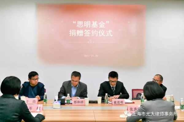 2017年11月20日下午,“思明基金“捐贈協議簽約儀式在華東師大地理館舉行。上海市光大律師事務所合伙人虞思明,華東師范大學對外聯絡處處長、基金會秘書長邢和祥,法學院院黨委書記張惠虹,副院長岑峨,刑法學科帶頭人錢葉六教授、院長助理于浩,院團委書記、學生工作負責人王沁怡共同出席了會議。儀式由法學院副院長岑峨主持。