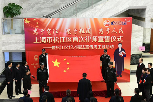 為引導(dǎo)廣大律師牢固樹立做中國特色社會(huì)主義法治工作者的信念,增強(qiáng)律師的職業(yè)使命感、榮譽(yù)感和社會(huì)責(zé)任感,12月4日上午8點(diǎn)15分,在松江區(qū)行政中心8號(hào)樓一樓大廳,松江區(qū)依法治區(qū)領(lǐng)導(dǎo)小組辦公室、松江區(qū)司法局、上海市律師協(xié)會(huì)松江律師工作委員會(huì)聯(lián)合組織松江區(qū)首次律師集體宣誓儀式暨12.4憲法宣傳周主題活動(dòng)。