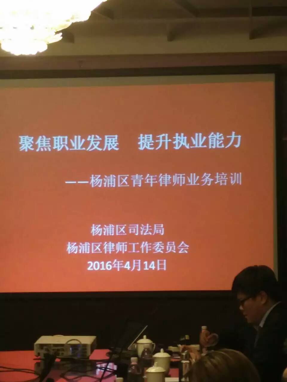 4月14日下午, 楊浦區(qū)司法局和區(qū)律師工作委員會主辦的2016年度區(qū)首屆青年律師業(yè)務(wù)培訓班在錦雪苑成功舉行,培訓取得了良好的效果。