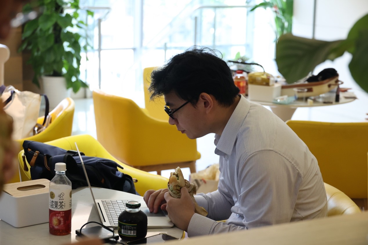 (圖為比賽現(xiàn)場男律師團員抽空辦公)