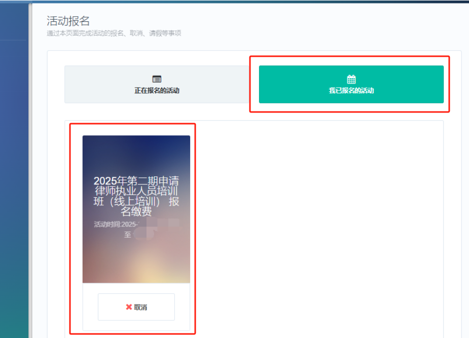 4.點擊“已報名活動”,選擇“2025年第二期申請律師執業人員培訓班”,點擊“繳費”;