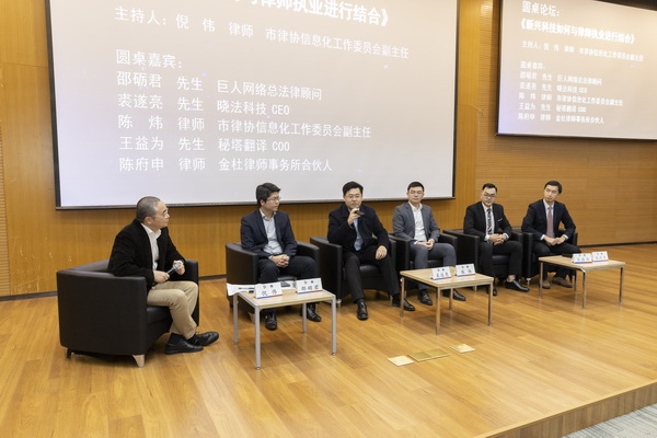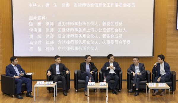 兩位嘉賓的主題發言環節后,進行了三場別開生面的圓桌討論會。第一場的圓桌會,由市律協信息化工作委員會委員徐沫律師主持,圓桌嘉賓均來自本市在律師行業信息化建設方面頗有心得的律師代表:市律協信息化工作委員會主任、上海市通力律師事務所合伙人陳巍律師、國浩律師(上海)事務所合伙人倪俊驥律師、 君合律師事務所上海分所合伙人周輝律師、北京市中倫(上海)律師事務所合伙人高俊律師、上海市方達律師事務所合伙人馬凌君律師。討論圍繞《新興科技與行業發展、事務所管理》展開,各位嘉賓結合自身實踐分享自身的經驗、觀點和見解,交流行業普遍關注的實際需求。