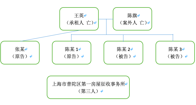 上海市旬陽(yáng)新村7號(hào)(以下稱系爭(zhēng)房屋)為被征收公房,承租人為王英。該房屋來(lái)源是在1964年用上海市甘泉三村3號(hào)調(diào)配而來(lái)。張某、陳某1、陳某3、陳某2與陳旗、王英為系爭(zhēng)房屋的受配人,房屋承租人原為陳旗,1981年變更成為王英。征收時(shí)在冊(cè)戶籍只有陳某3一人。原因是 (1)張某的戶籍于965年10月,遷至上海市崇明區(qū)農(nóng)場(chǎng);1990年1月10日,遷入其單位調(diào)配的上海市普陀區(qū)曹楊某村111室的房屋內(nèi)。(2)陳某2的戶籍于1970年11月12日,遷至黑龍江大興安嶺,現(xiàn)戶籍登記于上海市靈石路某弄222室。(3)陳某1的戶籍則于2006年8月28日,自其單位分配的昌化路333室房屋內(nèi)遷入上海市普陀區(qū)光新路四新村555號(hào)。(4)陳某3的戶籍1976年6月14日,遷至安徽省蕪湖市。1998年7月18日,陳某3因退休將戶籍從安徽省蕪湖市遷回系爭(zhēng)房屋內(nèi)。王英過(guò)世后,該戶籍戶主變更登記為陳某3。系爭(zhēng)房屋承租人仍登記為王英。王英生前曾經(jīng)與陳某3一起共同居住于系爭(zhēng)房屋內(nèi)。2003年前后,因王英患病無(wú)法照顧陳某3,陳某3遂至蘇州與女兒共同生活。張某、陳某1及陳某2戶口遷出后均不居住在系爭(zhēng)房屋內(nèi)。