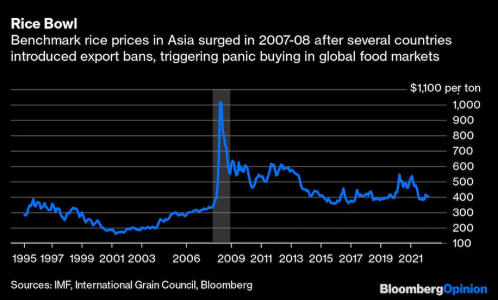 2008年饑荒中,稻米價格漲幅驚人,明顯蓋過小麥價格漲幅,從非洲到亞洲廣泛挨餓的都是稻米進口國,那一時期世界上出現了很多社會運動,表面上是政治動蕩,背后原因是饑餓。