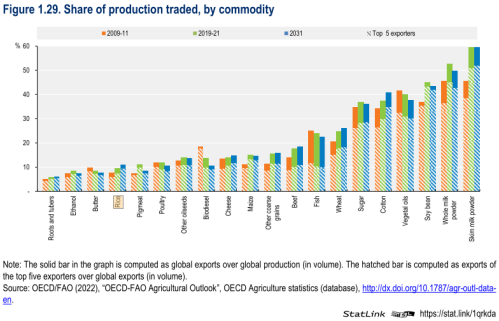 從國際貿易角度看,稻米是“少量富余用于交易”(thinly traded)。主要稻米出口國前四名印度、泰國、越南、巴基斯坦,自身是稻米的消費大國,而且沒有擺脫饑餓風險。稻米主要出口國中,只有出口量排名第五的美國無饑餓風險,可以敞開出口,但其產量不大。下圖來自經合組織與世界糧農組織2022年出版的《農業展望2022-2031》,豎軸代表出口比例,顏色代表不同年份,左邊第四位Rice是大米,右邊第七位Wheat是小麥,可見全球稻米出口占稻米產量的比例在10%,是各種糧食產品中最低的,小麥的交易比例一般在25%左右。