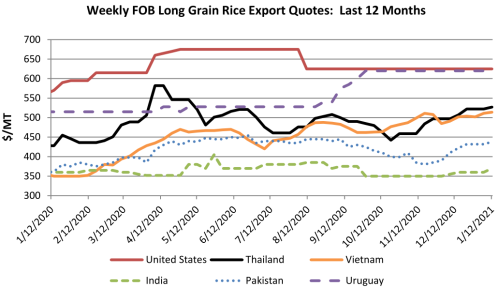 在稻米品質差別不大的前提下,各國出口米價懸殊極大,表明全球市場不統一,變數很大。下圖來自美國農業部2020年到2021年統計數據,顯示長米在不同出口國的FOB價格,印度賣三百多美元每噸,美國的要六百多美元每噸。各稻米出口國米價差別很大,稻米國際貿易不是根據市場情況自發調節。政府時常干預米價,最常見的方式是補貼小農戶,使得低效農業能維持下去。政府時常干預調整,市場就不好預測,資本就不敢介入。小農經濟條件下,存糧可以通過家庭消費或飼養畜禽消化;資本經營條件下,存糧無法消化,資本無法回收,也無法進行下一輪耕作。