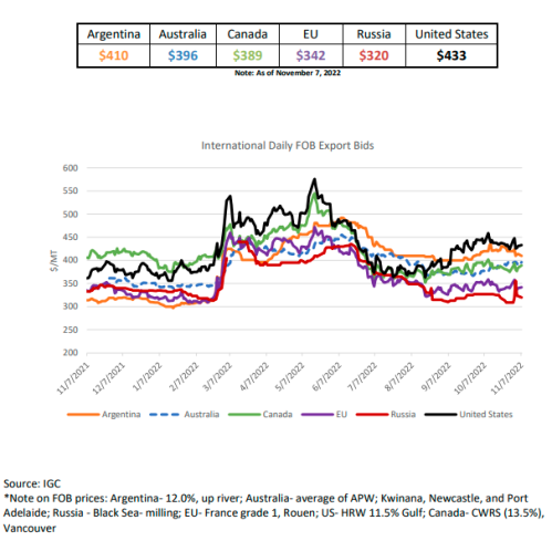 稻米的上述缺陷小麥都沒有,小麥市場供應充足很少人為干預。下圖來自美國農業部2022年11月《谷物 全球市場和貿易》, 可見各國小麥出口價格差異小且漲跌一致,這是成熟市場的特征。