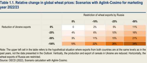 2022年初俄烏戰爭爆發,這兩個國家都是小麥主要出口國,下圖是世界糧農組織FAO和經合組織OECD預測了俄烏戰爭對2022-2023年度小麥價格的影響。