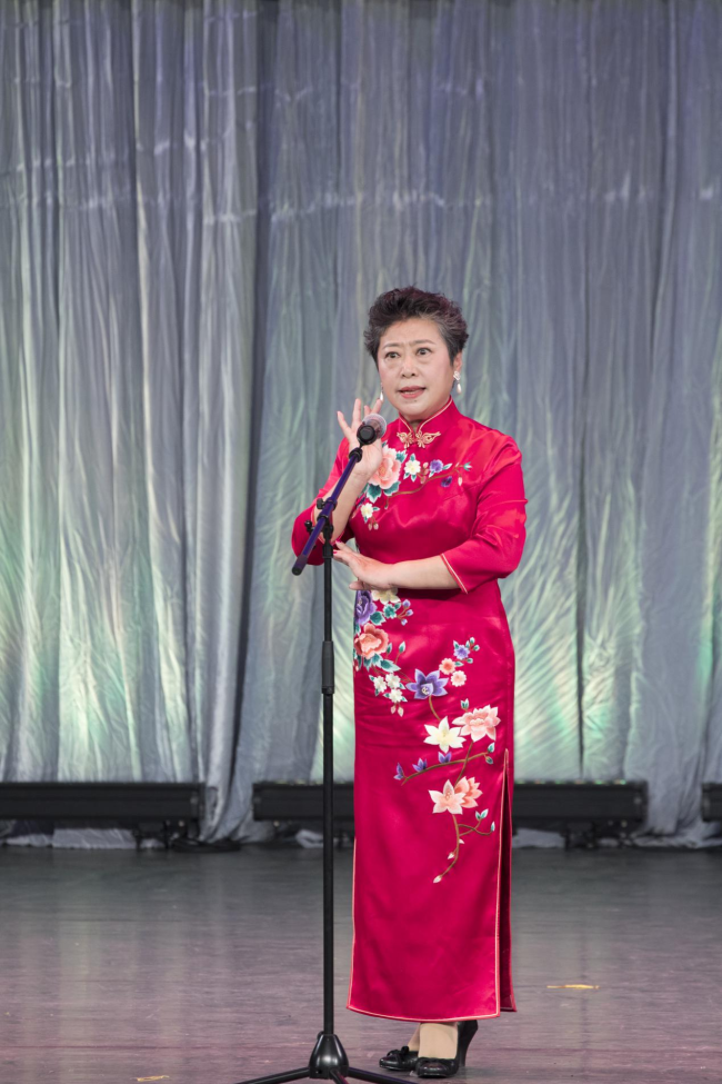 款款京胡聲中,市律協原副秘書長劉小禾緊接著上臺,帶來了張派名劇《望江亭》選段。這出戲是張君秋先生的代表作,劉老師自學之外又請了京劇院的蔡筱瀠為其指導。只見她一襲紅色演出服,儀態雍容,氣質端莊;嗓音甜美,行腔綺麗多變,帶給了觀眾很好的藝術享受。黃綺律師表演的程派《龍鳳呈祥》唱段,扮相華麗,在六個配演宮女眾星拱月的襯托下,一出場就使人眼前一亮。而沉郁凝重的程腔,更是與張派、梅派的風格截然不同,使得觀眾“如聞仙樂耳暫明”,沉浸在一派深邃悠遠的程腔秋韻之中。在觀眾的掌聲中,錢麗萍律師再次登臺,帶來了《法場換子》,不溫不火的做派,沉穩老練的臺風,將劇中人“徐策”演繹得相當完美。